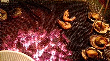ホタテに海老に鮑。あと牡蠣やらエビラ(?)などなど海に面したテラスで炭火焼きしてくれるんだ♪