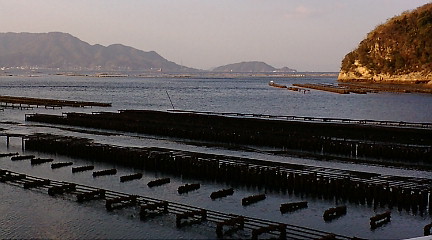 目の前は牡蠣筏ね。向こうの島はたぶん江田島。