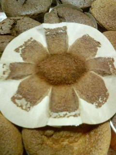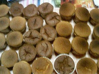 右からオレンジ(アールグレイの紅茶の葉も入れてるので、紅茶の匂いの方がキツイ)、真ん中の凹んでるのがココア(ベーキングパウダーを入れ忘れたw)、左がマンゴー(マンゴージュースを入れてみた)です。